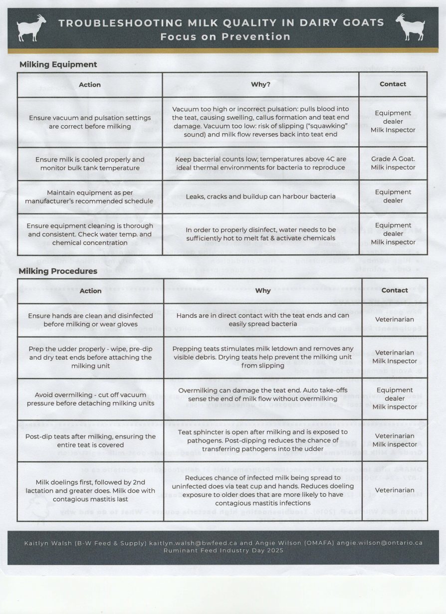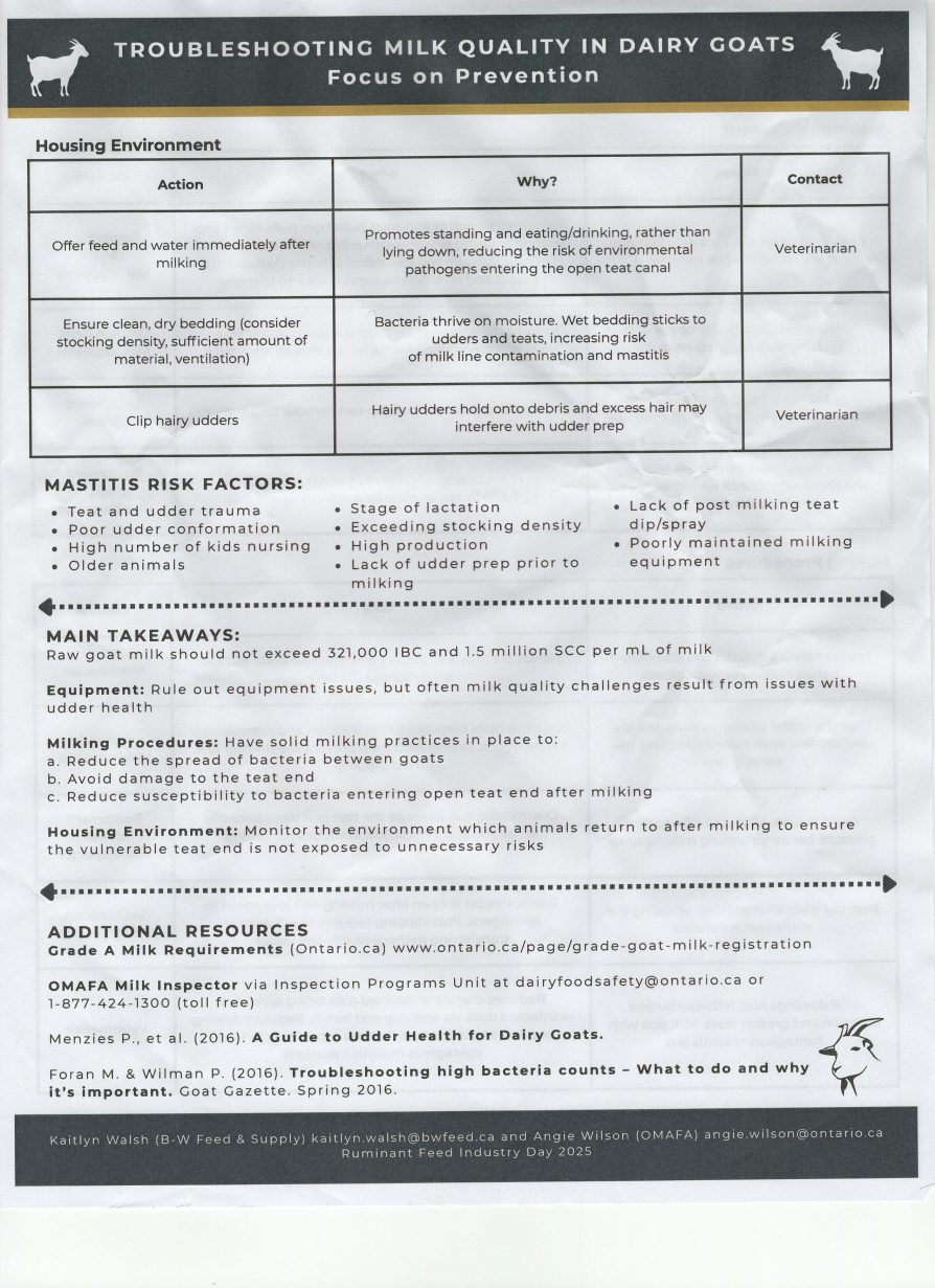 Ontario Goat would like to draw your attention to this useful information package on the topic of Trouble shooting milk quality in dairy goats, with a focus on prevention. This information was graciously provided by Kaitlyn Walsh of BW-Feeds & Supply and Angie Wilson of OMAFA.